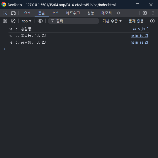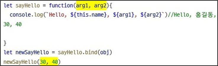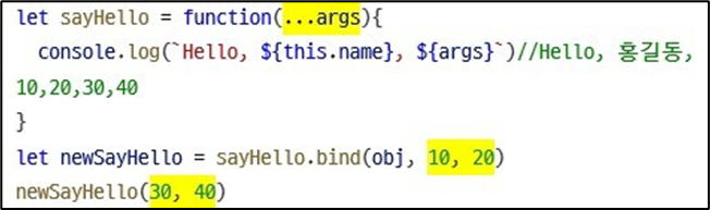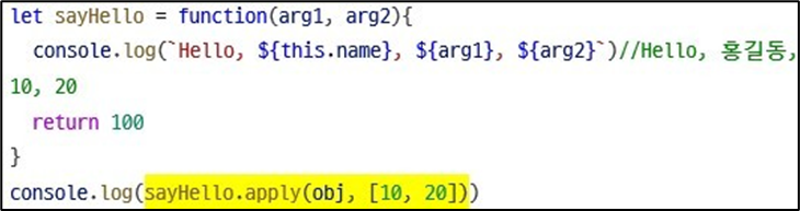 sayHello1.apply(obj1, [10, 20])//Hello, 홍길동, 10, 20
