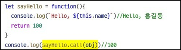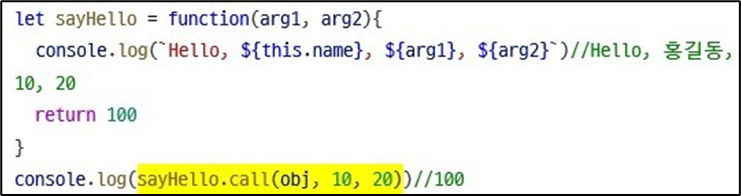 sayHello1.call(obj1, 10, 20)//Hello, 홍길동, 10, 20