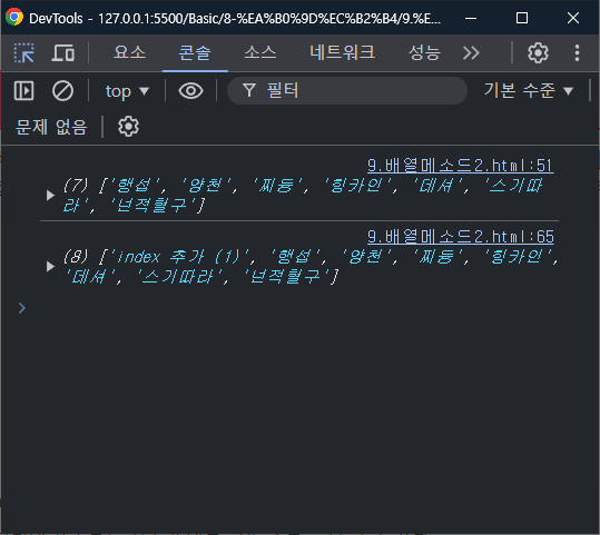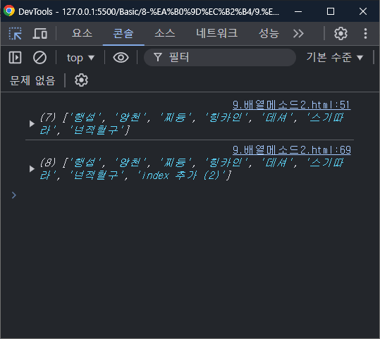 배열의 끝 부분에 'index 추가 (2)' 추가 된 것을 확인 할 수 있다.