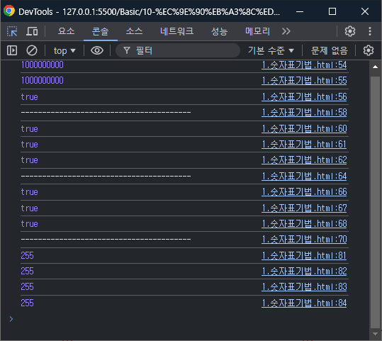 자바스크립트는 16진수와 8진수, 2진수를 표현하는 방법도 있다.