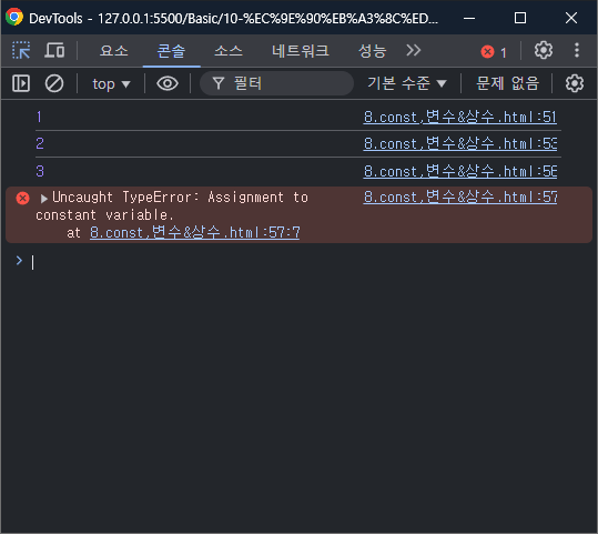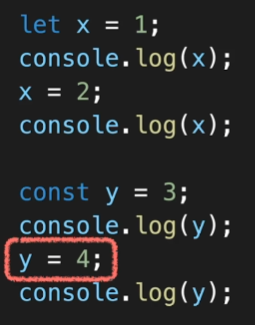 const로 선언한 다음에 새로운 값을 할당하려고 하면 오류가 발생하는 것을 볼 수 있다.
