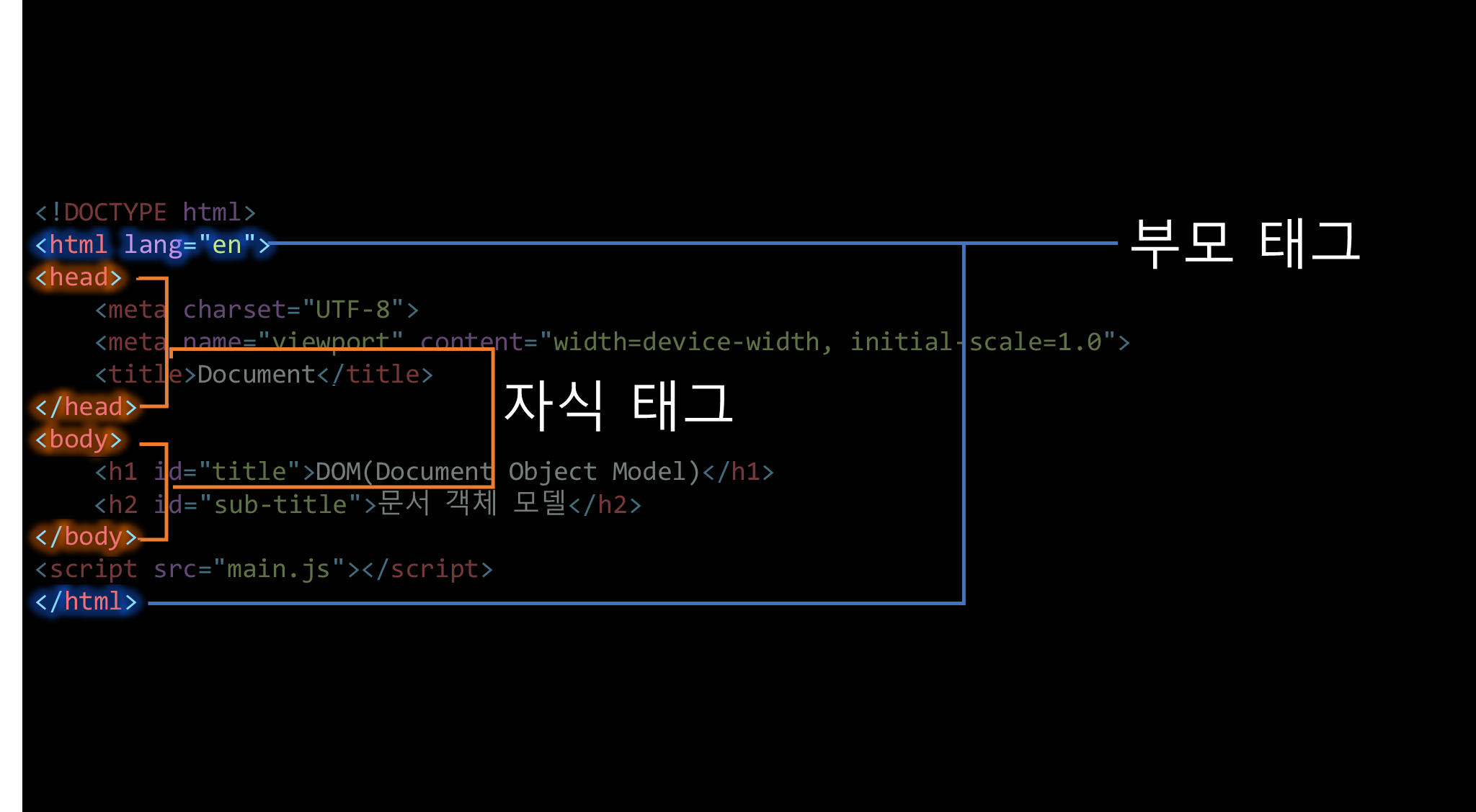 body 태그 안에는 h1,h2 태그와 script 태그로 이렇게 태그 안에 태그 형태의 계층 구조를 이루고 있다.