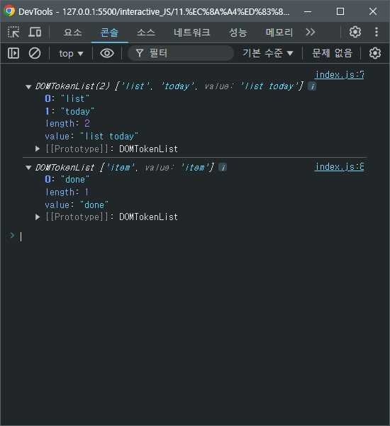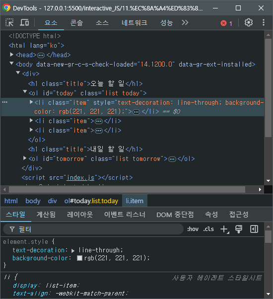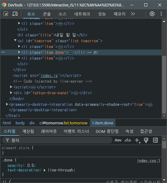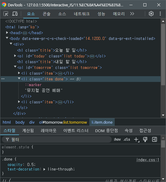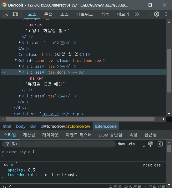 결과를 보면 item 클래스는 사라지고 done 클래스로 변경된 것을 확인할 수 있다.
