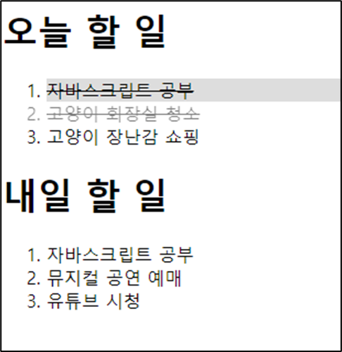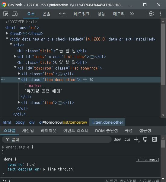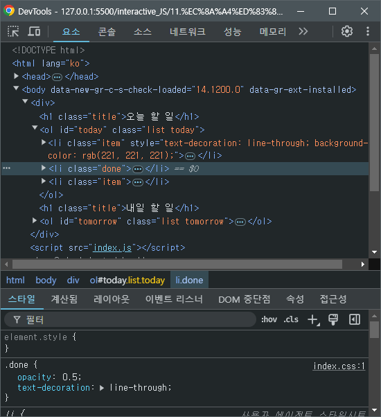 즉 CSS파일의 done 클래스에 미리 작성해둔 투명도와 텍스트 취소선이 적용된 것을 학인할 수 있다.