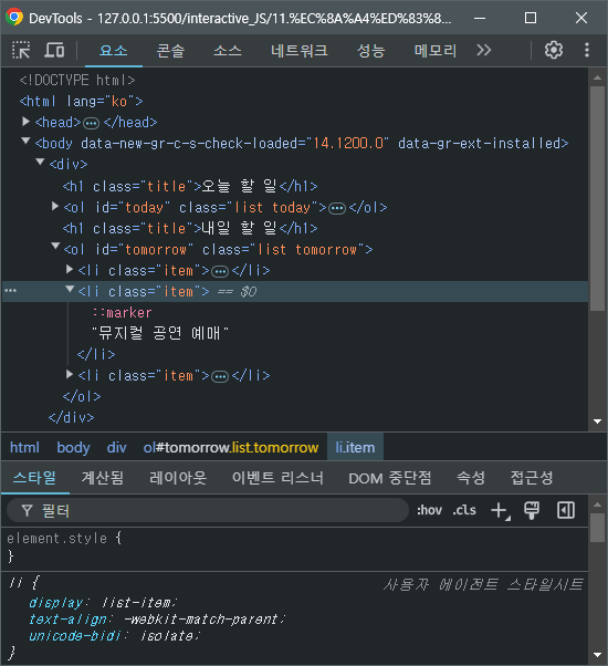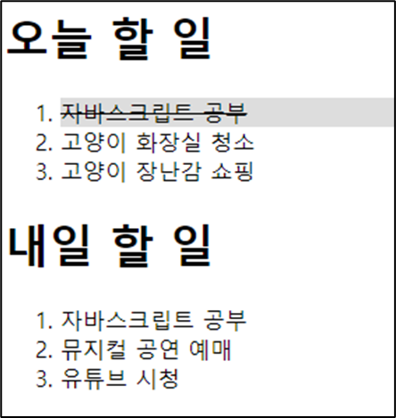 코드를 보면 내일 할일의 자식 요소들 중에서 1번 인덱스이므로 '뮤지컬 공연 예매'가 선택 되었고