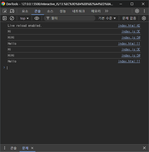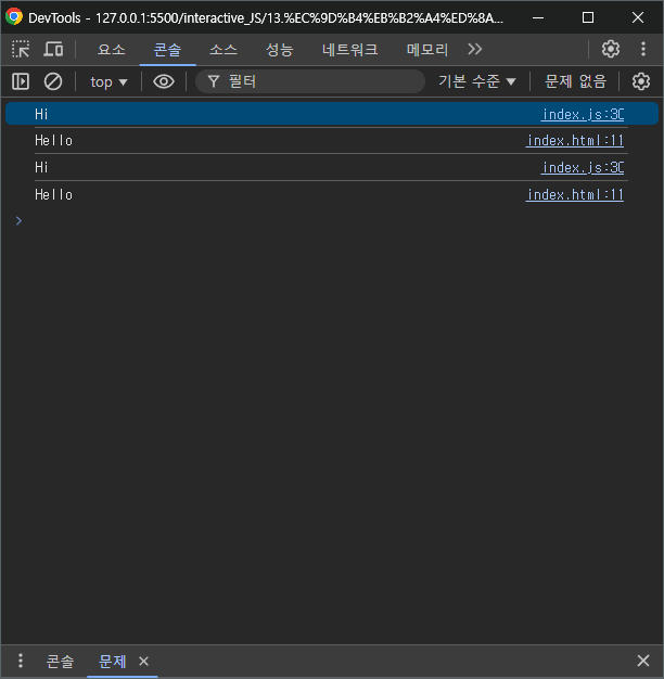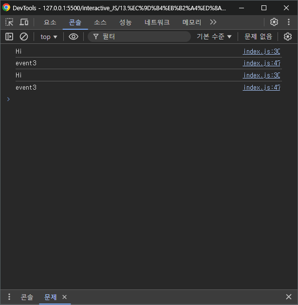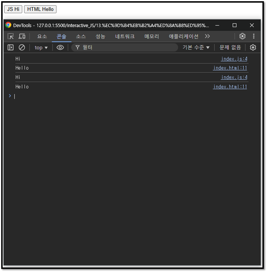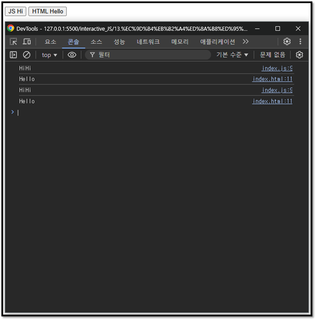'JS click!' 버튼을 클릭하면 event1만 동작하므로 'Hi'만 출력되는 것을 확인할 수 있다.