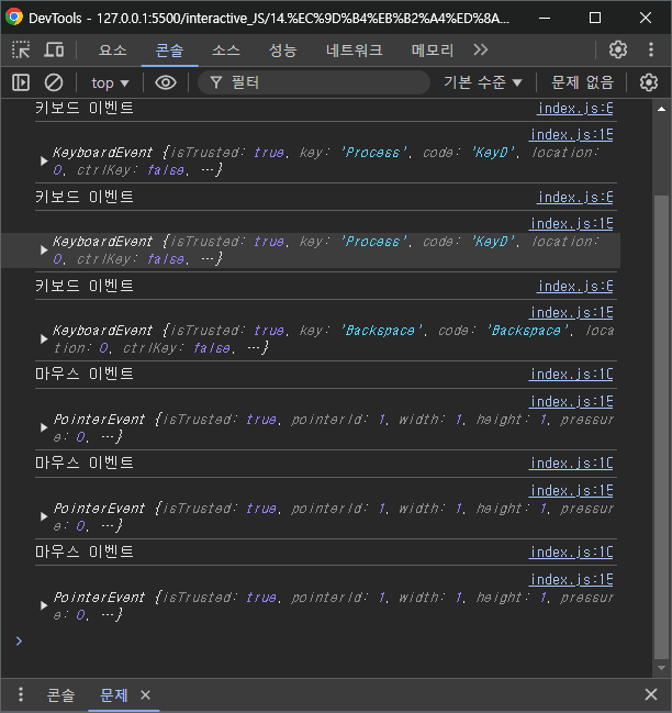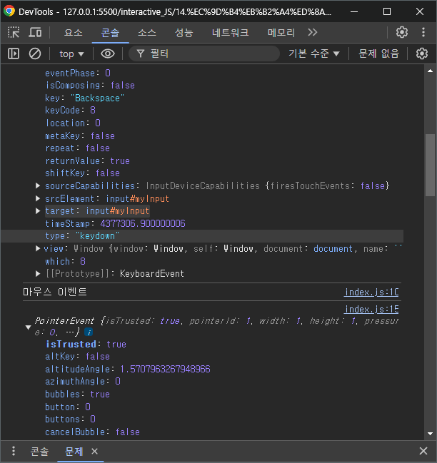 코드를 보면 키다운 이벤트가 발생할 때도 이벤트 객체가 출력이 되고