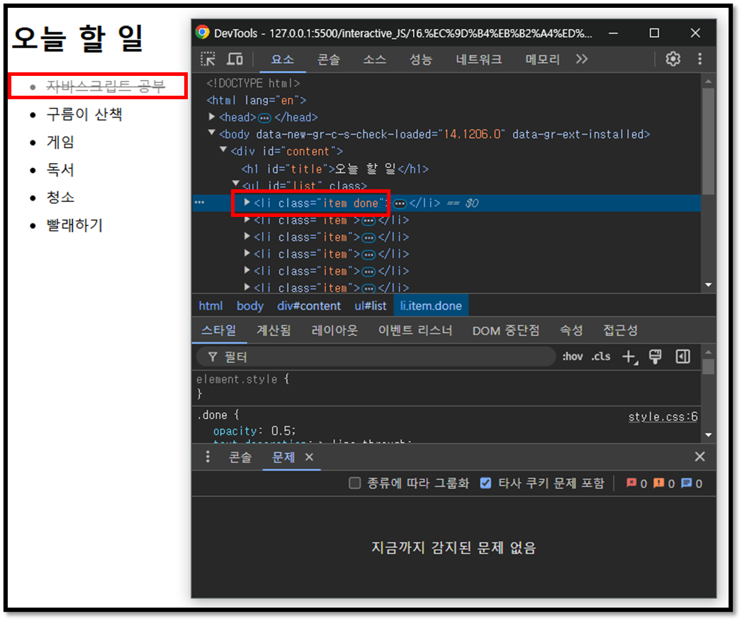 이렇게 리스트에도 'done' 클래스가 추가된 것을 확인 할 수 있다.