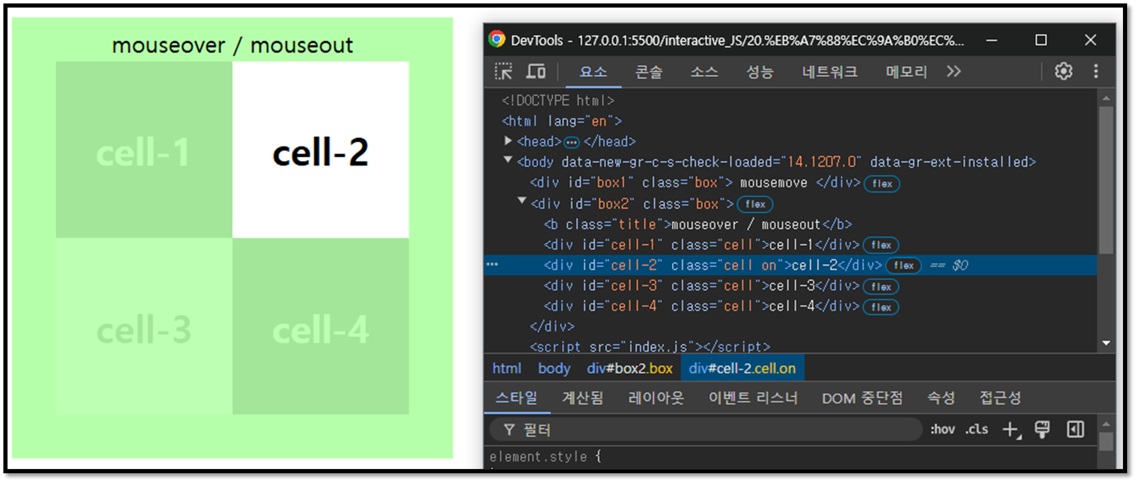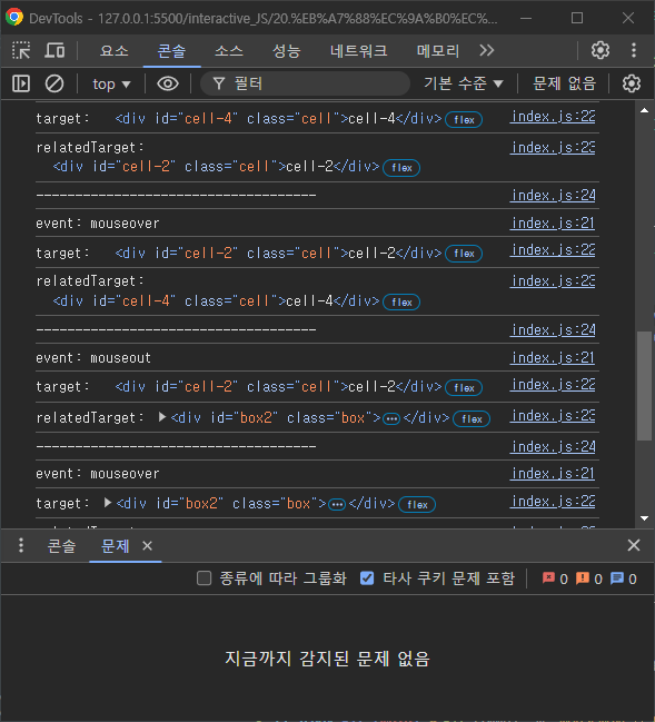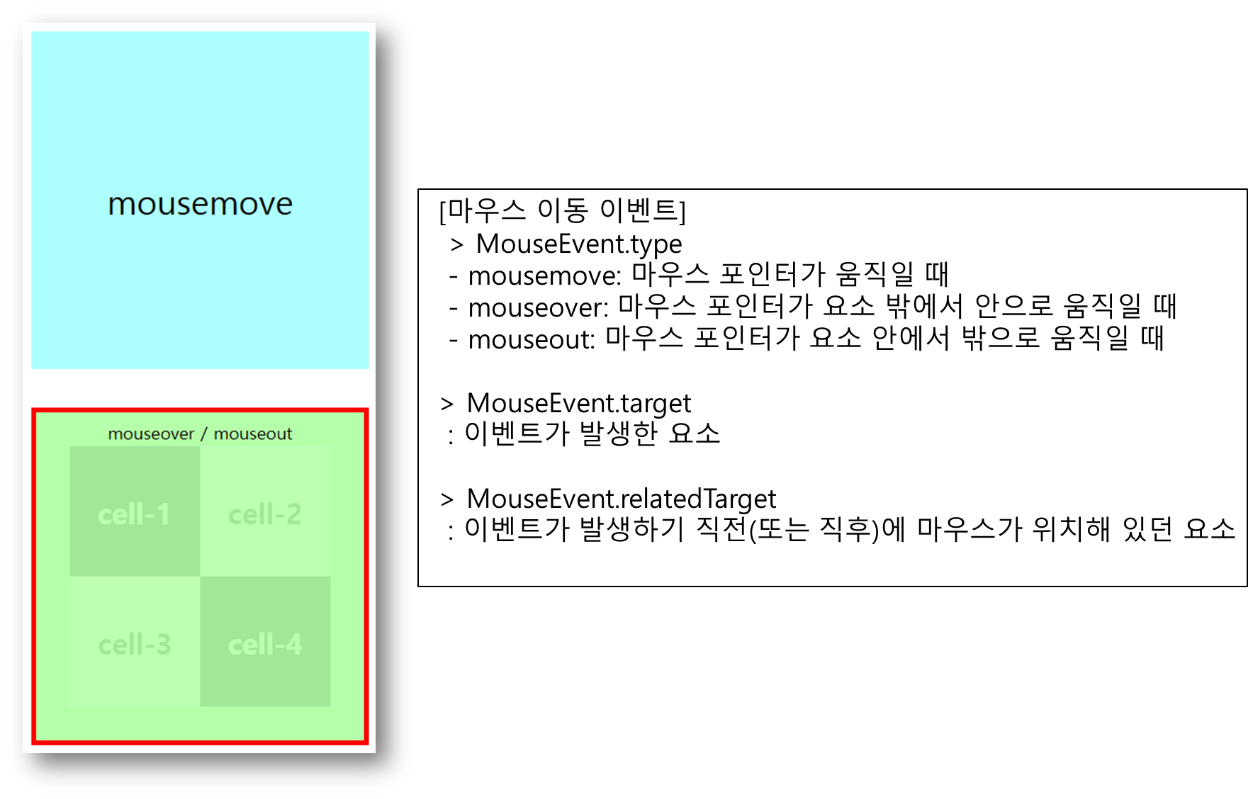 결과값을 살펴보면 mouseover 일 때 target이 cell-2고 relatedTarget이 cell-4이므로