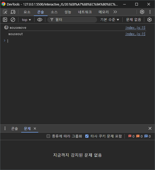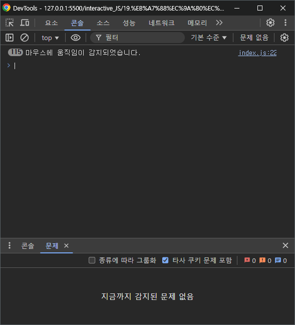요소 위에 마우스가 움직일 때마다 이벤트 핸들러가 동작하는 것을 확인할 수 있다.