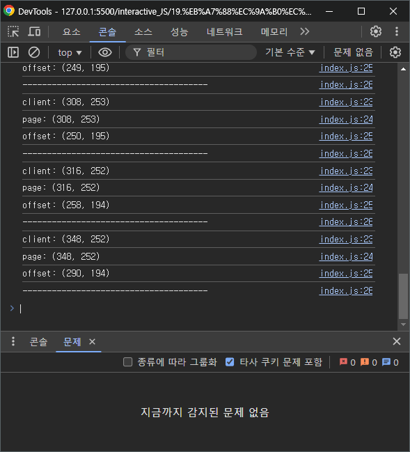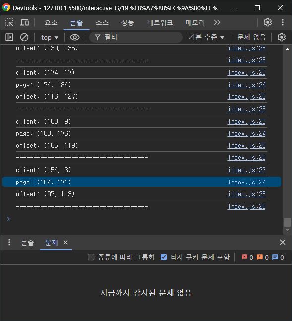 또한 스크롤을 한 상태에서 보면 client와 page의 y값이 조금 차이가 나는 것을 볼 수있는데