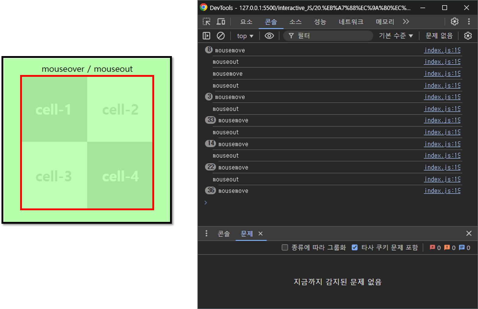 직접 실행해서 자세히 보면 요소끼리 이동할 때 mouseout,mouseover 순서대로