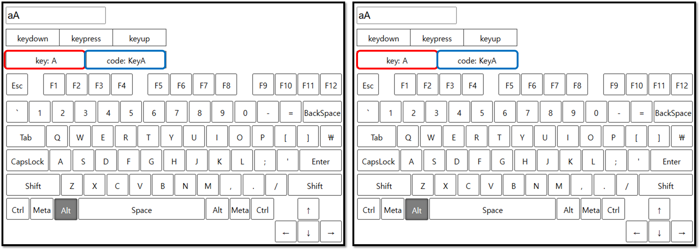 출력이 가능한 key더라도 영어가 아닌 한글로 key를 입력하면 반응하지 않는 문제도 있다.