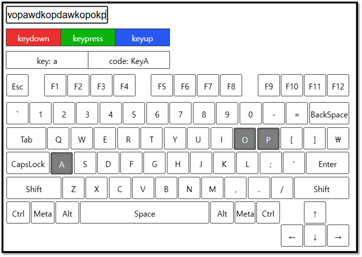 이미지에 나와있는 key:a 라는 것은 알파벳 소문자 a가 입력되는 key가 눌린것이고