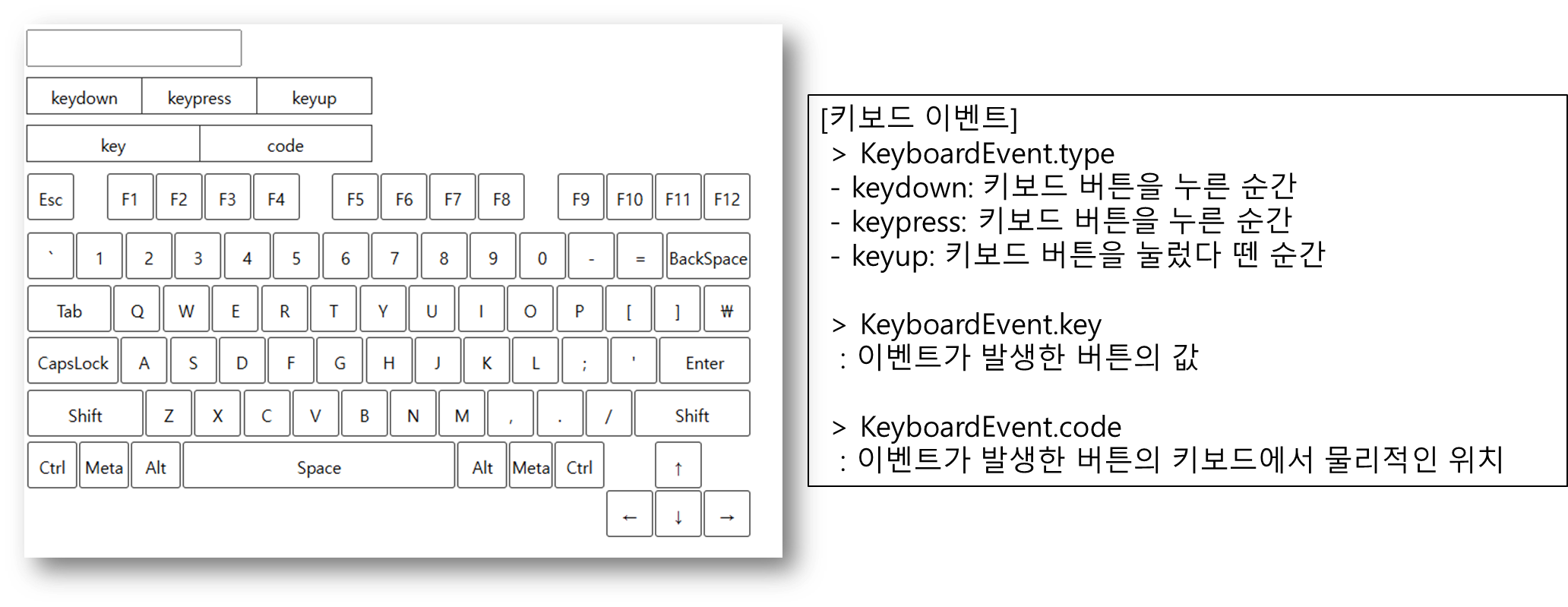 키보드 이벤트 타입으로는 키보드 버튼을 누를때 keydown, keypress 이벤트가 발생하고