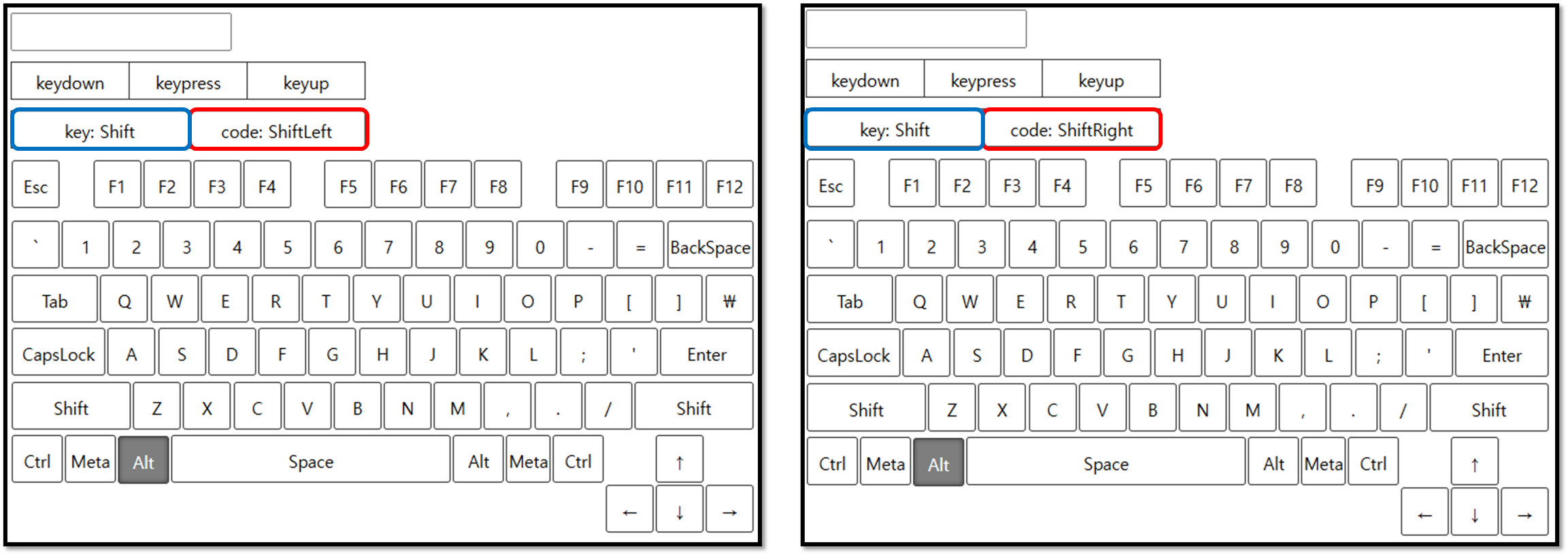key와 code 프로퍼티들이 각각 어떤 값을 담고 있는지 출력해주고