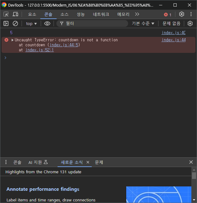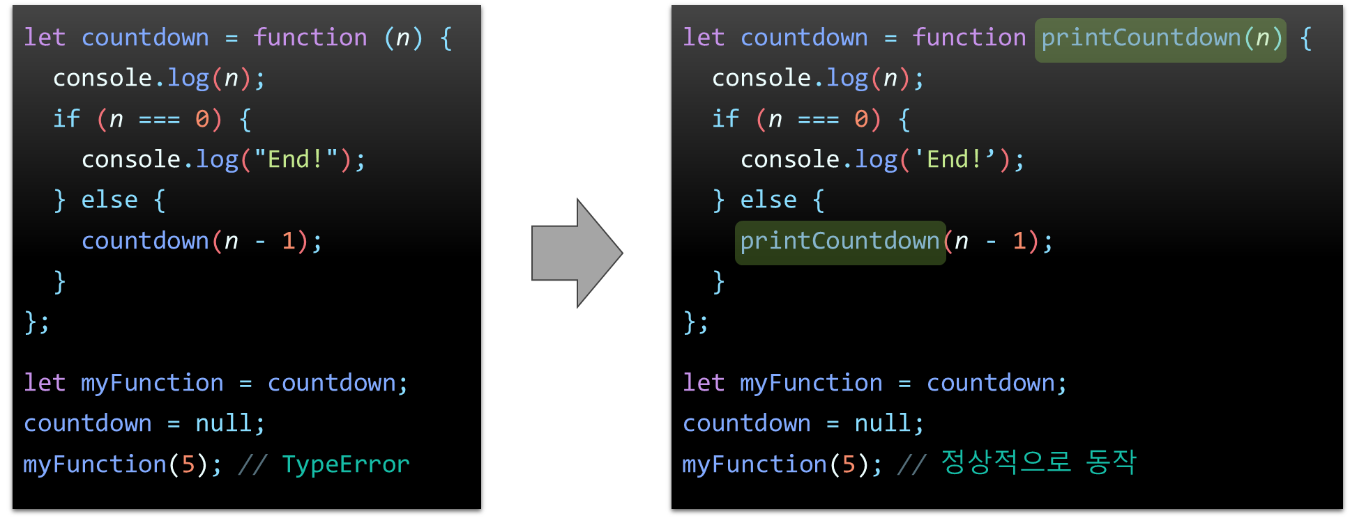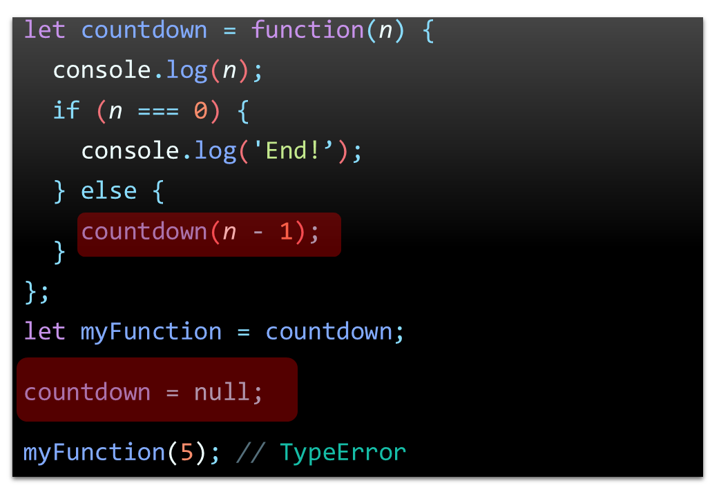 'countdown(n-1)' 동작을 수행할 때 호출하려는 countdown 함수가 이미 null 값으로 변경되었기 때문에