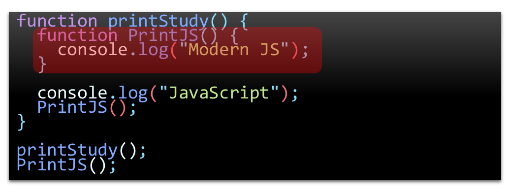 아래와 같이 함수 안에 선언된 함수는 함수 밖에서 호출할 수 없지만