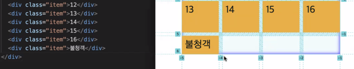 만약 특정 그리드 아이템의 위치를 바꾸기 위해 grid-column 또는 grid-row 등과 같은 속성을 부여하게 된다면