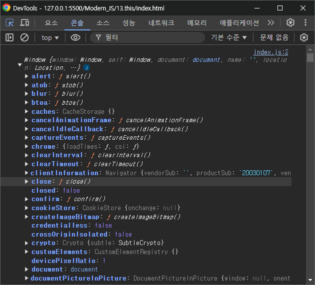 먼저 콘솔에 this 키워드를 출력해보면 window 객체가 출력되는 것을 확인할 수 있는데