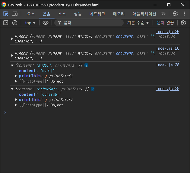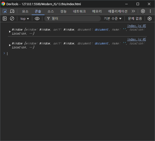 위 코드를 실행해보면 두 결과가 window 객체를 출력하는 것을 확인할 수 있다.