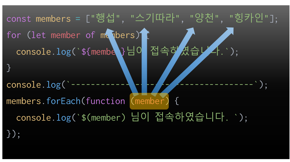 for of문과 비교하면 of 앞에 선언한 (let member) 변수와 역할이 똑같다고 볼 수 있다.