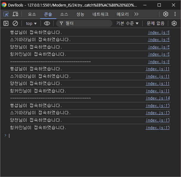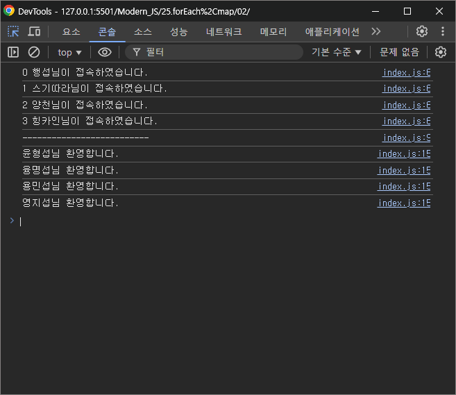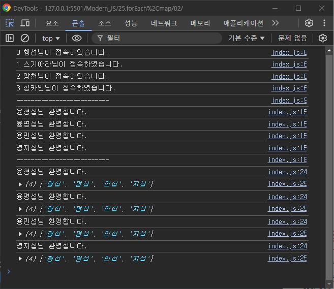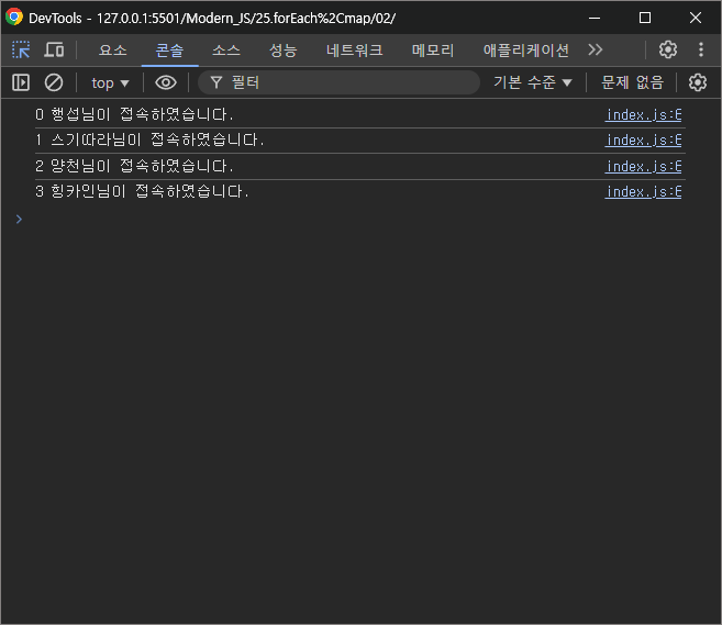 console.log(`${i} ${member}님이 접속하였습니다.`);