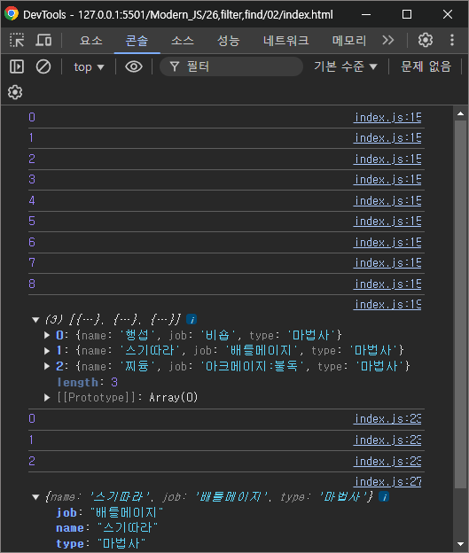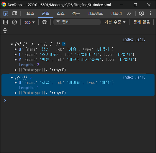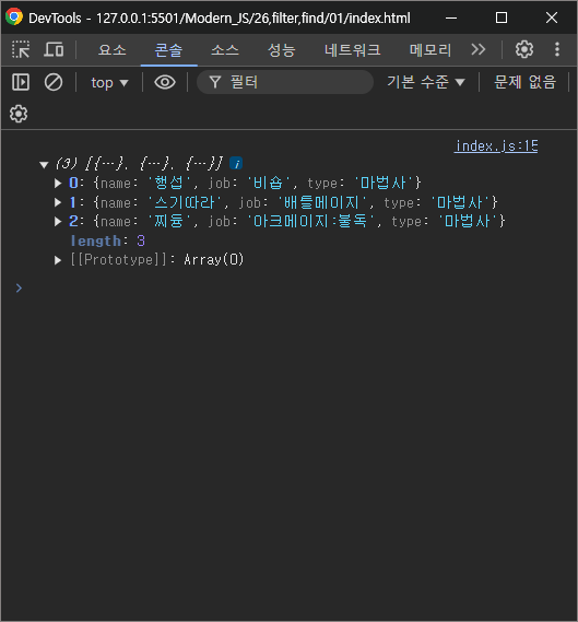 type이 "마법사"인 요소만 담겨있는 것을 확인할 수 있다.