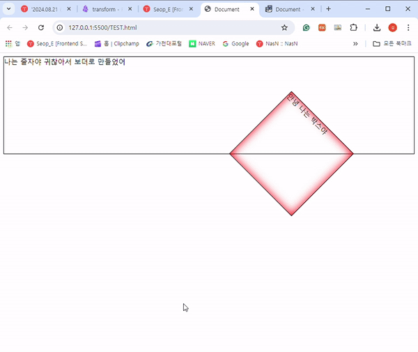 transform속성은 요소의 크기(scale), 위치(translate), 회전(rotate), 기울기(skew)를 적용할 수 있다.