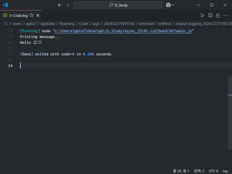 TestCallback 함수에 일반 함수(function 키워드로 정의된 함수)를 전달하여
