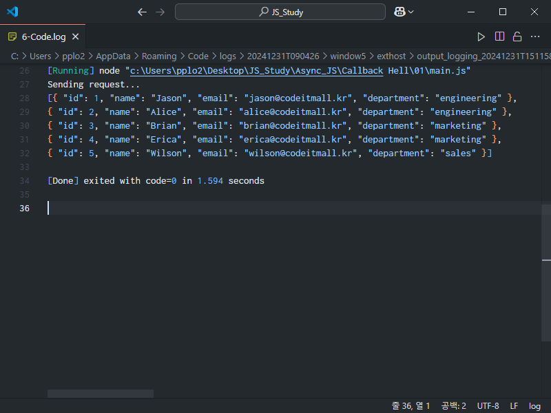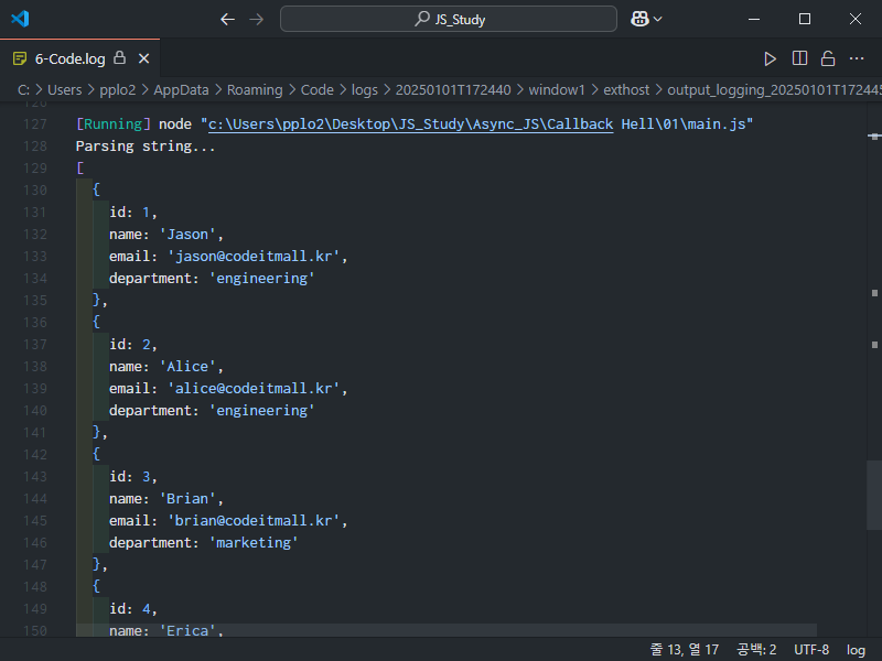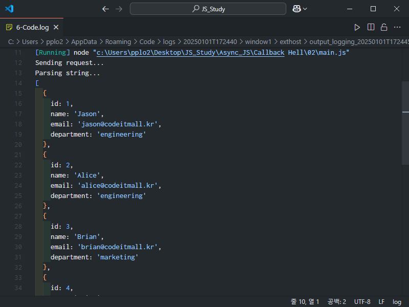 const response = `[{ "id": 1, "name": "Jason", "email": "jason@codeitmall.kr", "department": "engineering" }, { "id": 2, "name": "Alice", "email": "alice@codeitmall.kr", "department": "engineering" }, { "id": 3, "name": "Brian", "email": "brian@codeitmall.kr", "department": "marketing" }, { "id": 4, "name": "Erica", "email": "erica@codeitmall.kr", "department": "marketing" }, { "id": 5, "name": "Wilson", "email": "wilson@codeitmall.kr", "department": "sales" }]`;