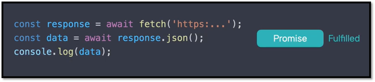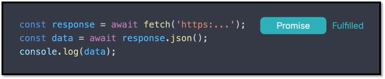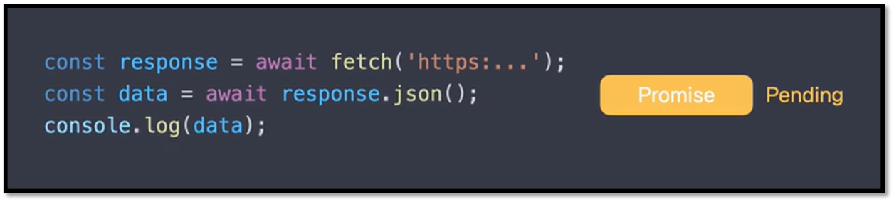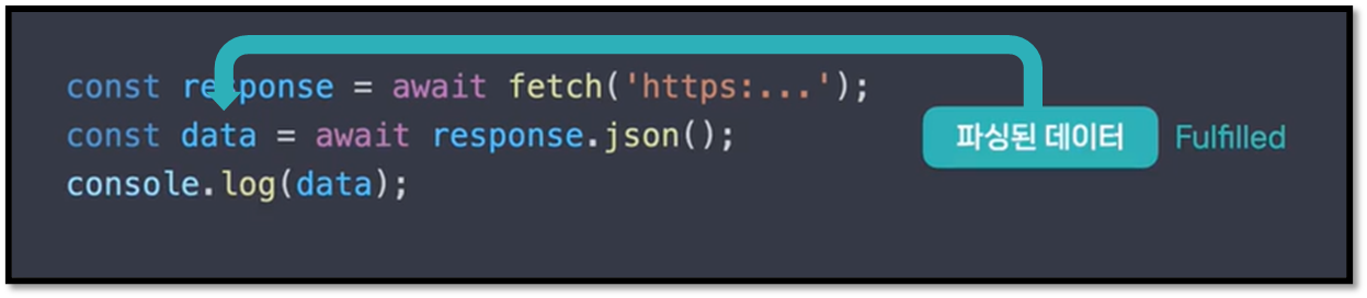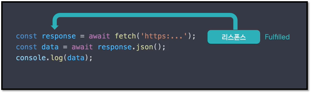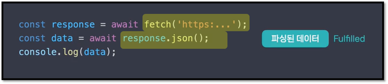- fetch는 Promise를 리턴하는데 await문이 있기 때문에 Promise가 Fulfilled 상태가 될 때까지 기다림