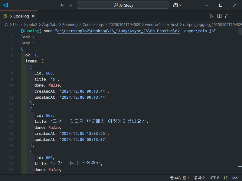 이렇게 Promise를 리턴하는 부분 앞에 await 키워드를 작성하면 되는데 실행해보면