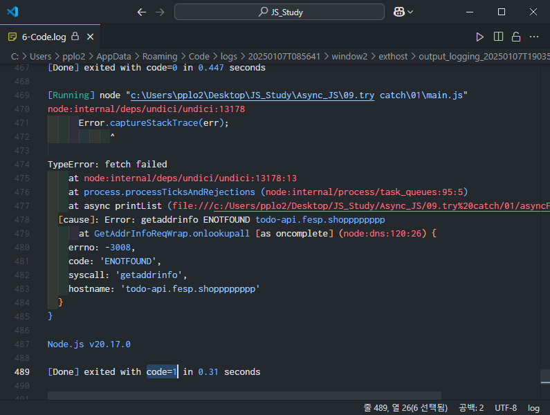 다음과 같이 오류 내용과 함께 code=1로 종료된다.