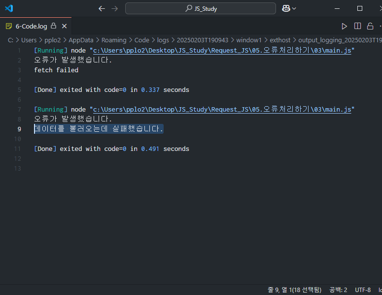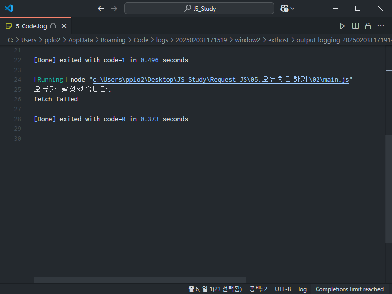 다음과 같이 오류 처리했던 메시지가 잘 출력되는 것을 확인할 수 있다.