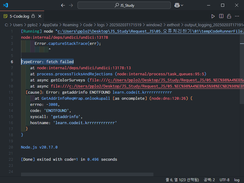 그리고 main 파일을 실행해보면 다음과 같이 타입에러 - fetch가 실패했다고 나온다.