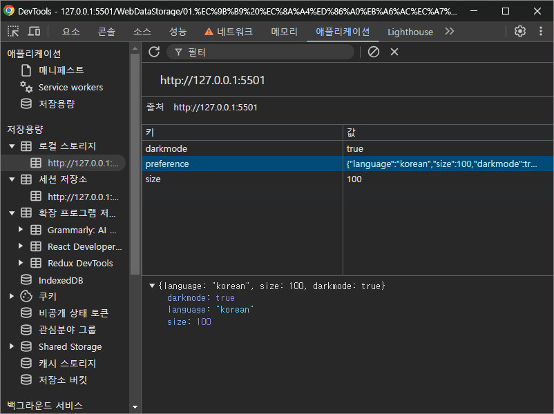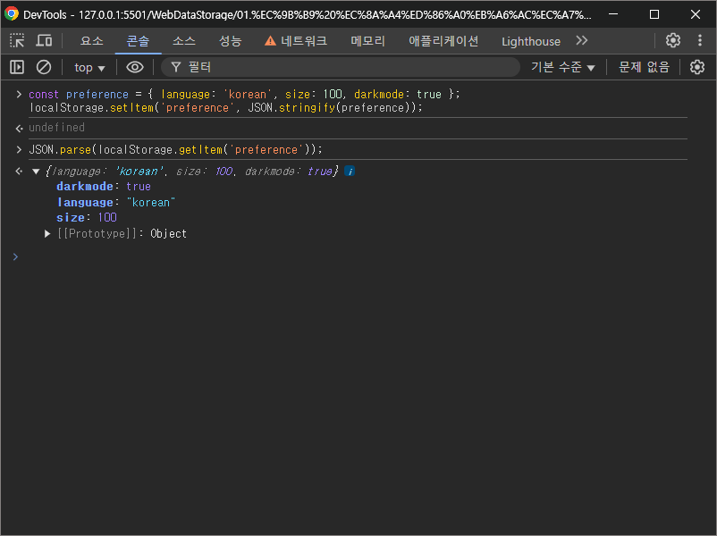 const preference = { language: 'korean', size: 100, darkmode: true };
