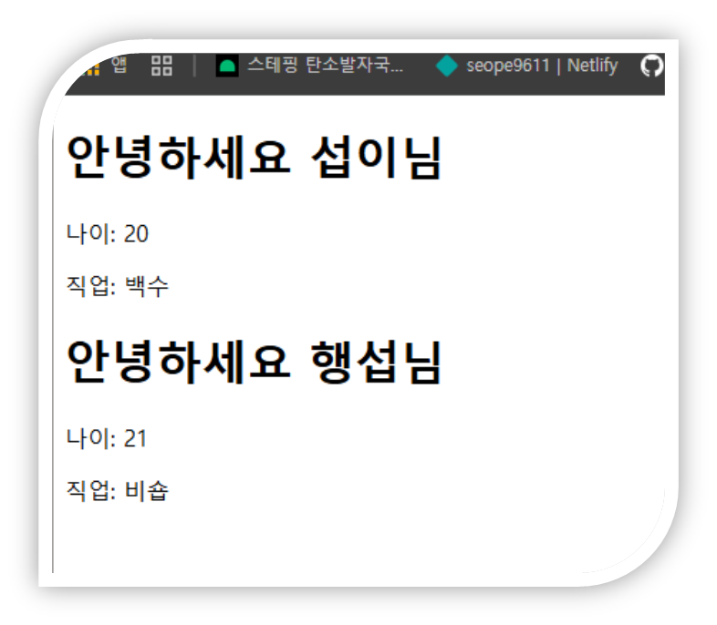 각 Greeting이 다른 props 값을 받아서 각각 다르게 표시된다.