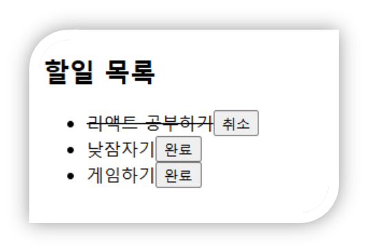 위와 같이 완료 버튼을 누르면 toogleTodo(n) 실행 -> id: n인 항목의 completed 값을 true로 변경되며