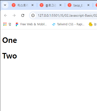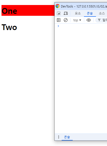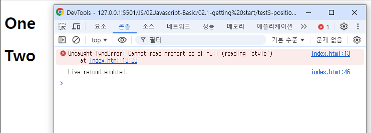 ▼작성 위치를 변경 후 확인해보면 에러가 없어지고 정상적으로 JS가 작동 하는 것을 볼 수있다.