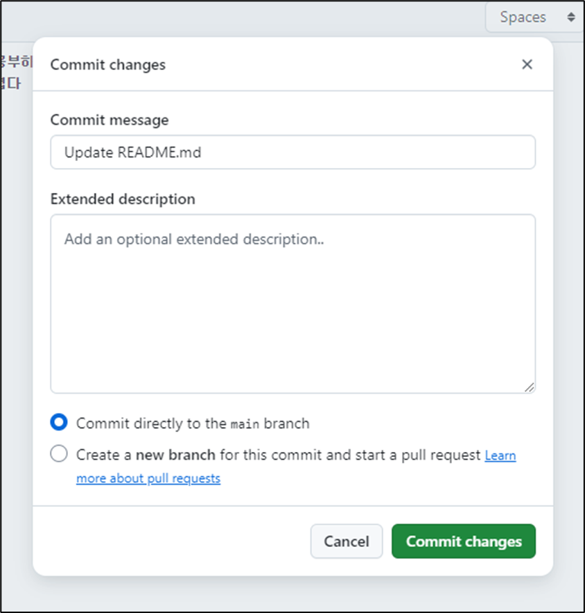 이렇게 깃허브에서도 직접 커밋을 진행할 수있다.