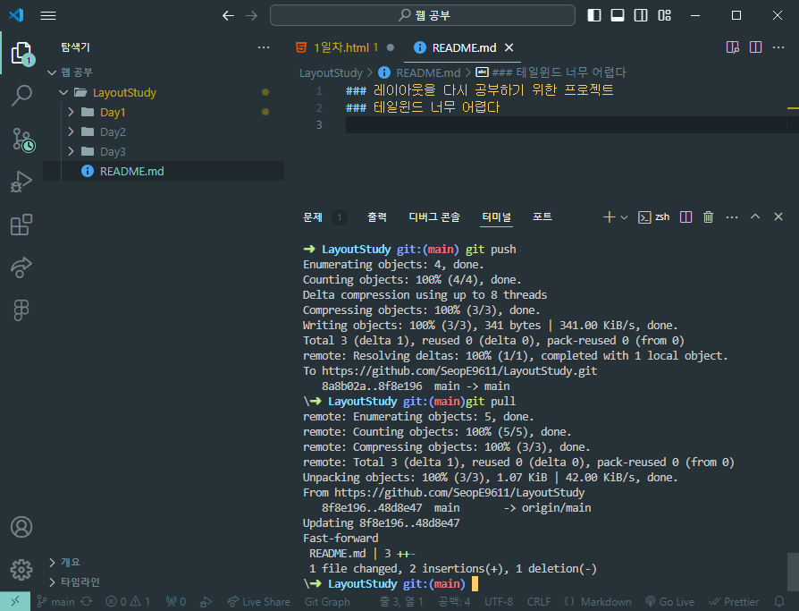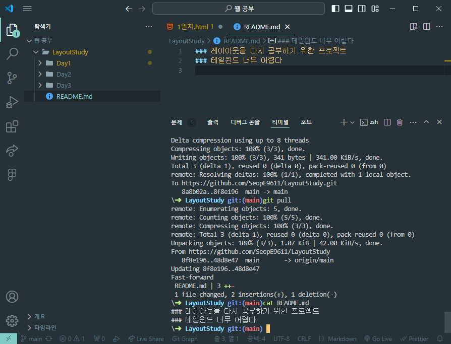 이제 리모트 레포지토리에 새로 추가된 내용을 내 로컬 레포지토리에 반영하기위해