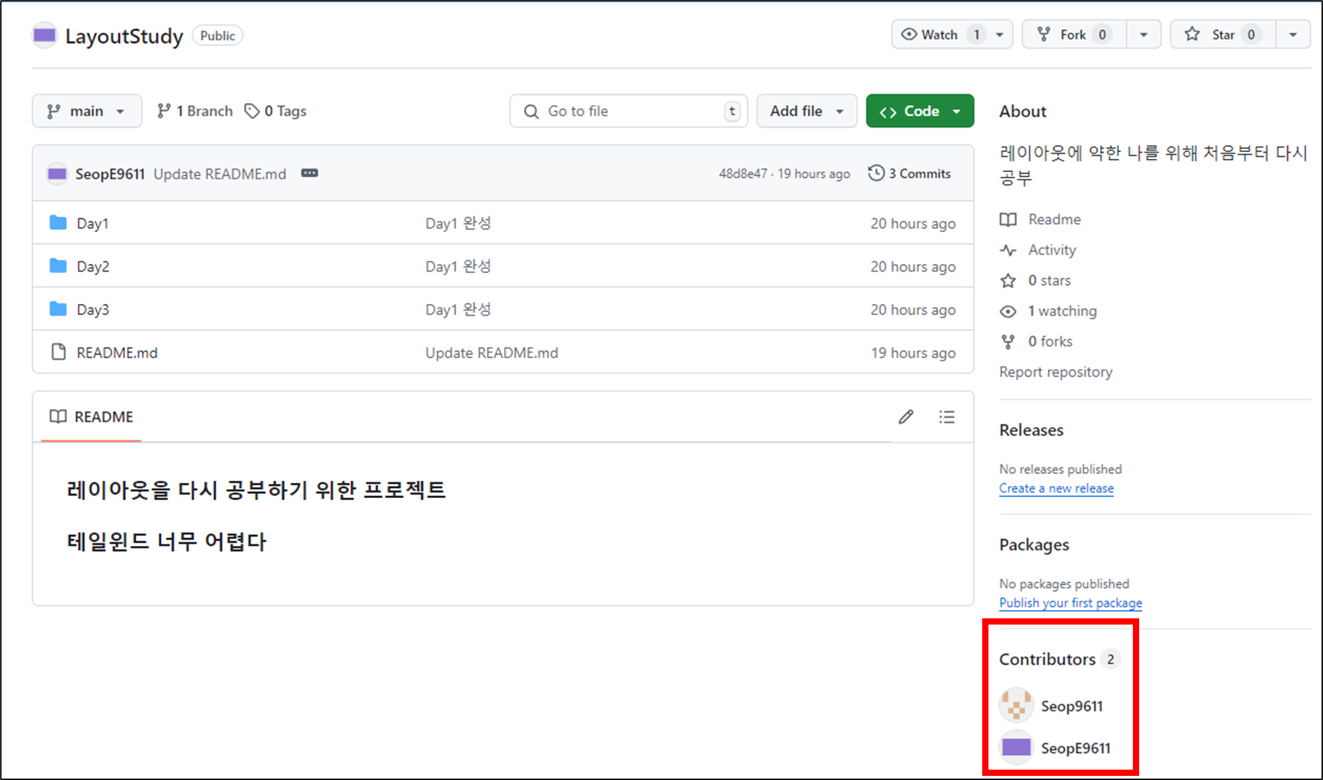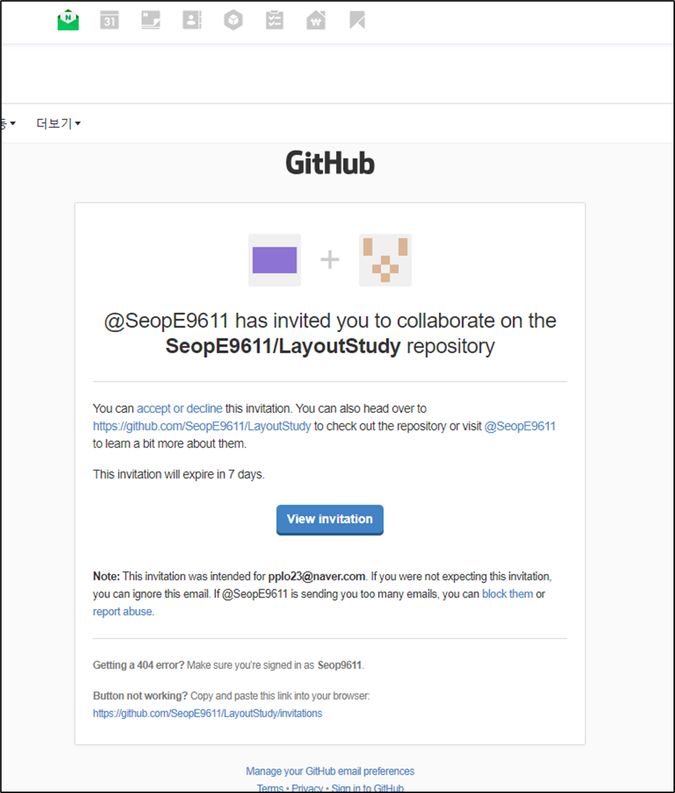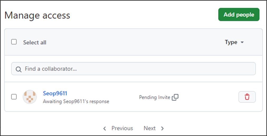 ▼ 상대방이 초대장을 받고 승인하면 본인이 소유한 레포지토리의 collaborator, 즉 협력자가 되는 것이다.