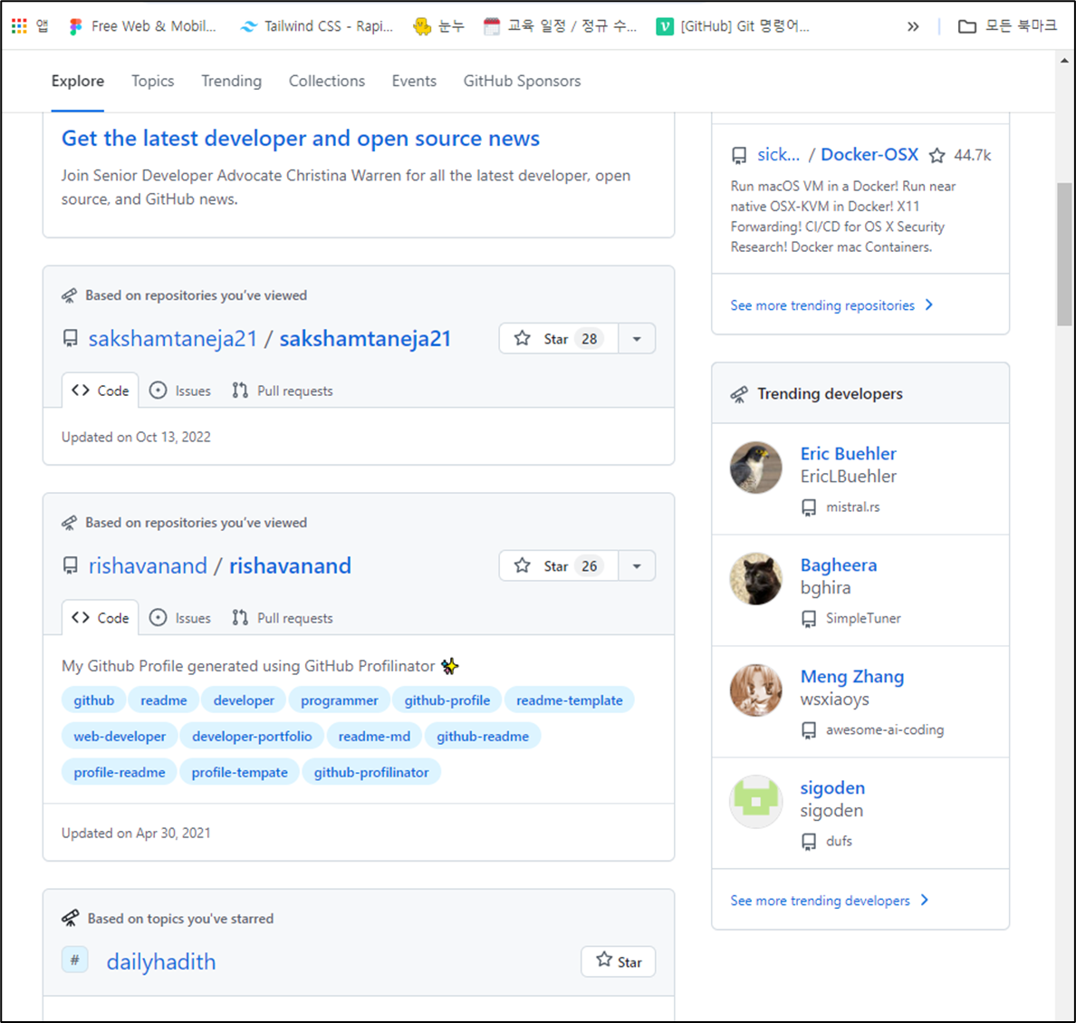 깃허브에서 추천하는 프로젝트를 가져와도 된다. 주로 본인이 관심을 가질만한 분야를 알아서 추천해준다.
