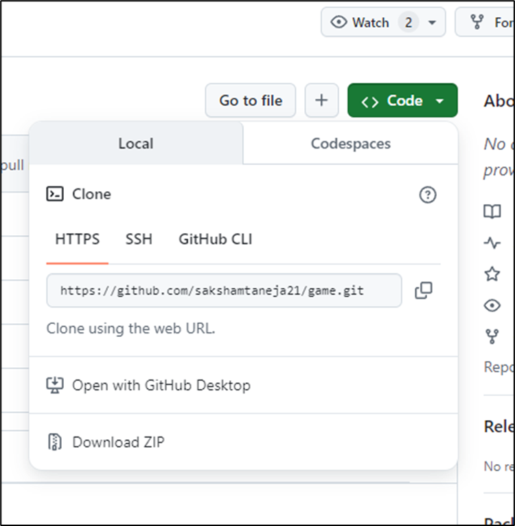 해당 레포지토리를 가져오려면 먼저 주소를 알아야하기에 오른쪽 상단에 초록색바탕 code 버튼을 클릭해주면