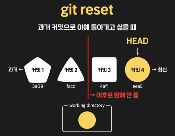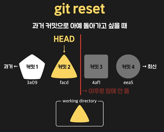 이렇게 "git reset" 을 사용하면 헤드가 과거의 커밋을 가리키게 할 수있고