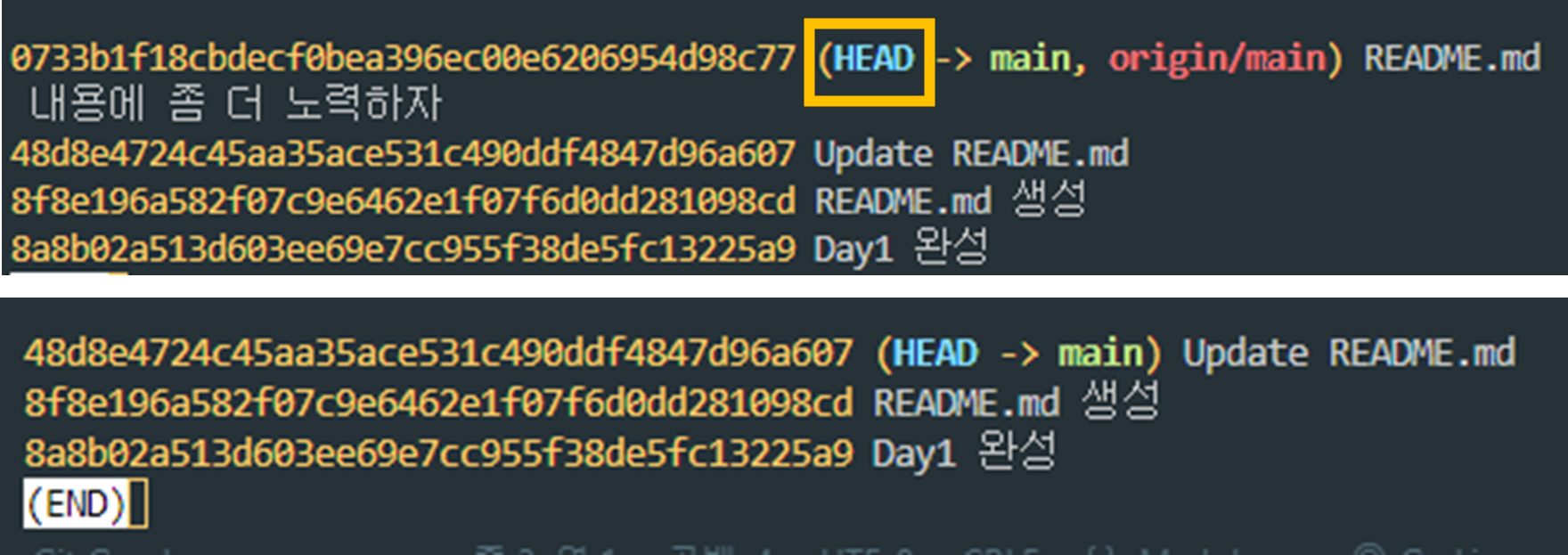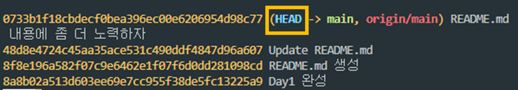 git log --pretty=oneline 에서 보면 상단에 HEAD라고 표시 되어있는 것을 볼 수가 있는데