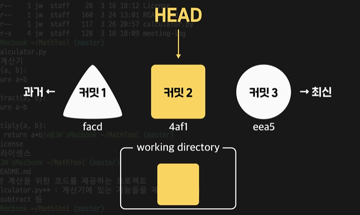 워킹 디렉토리의 내용도 과거의 커밋의 상태로 돌아가게 할 수있다.