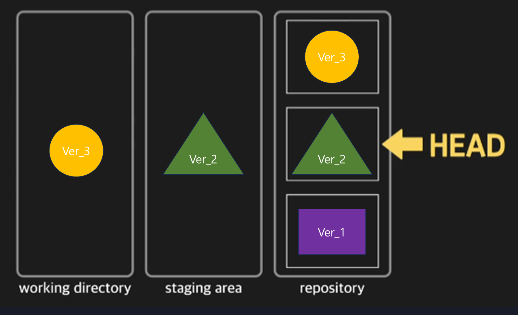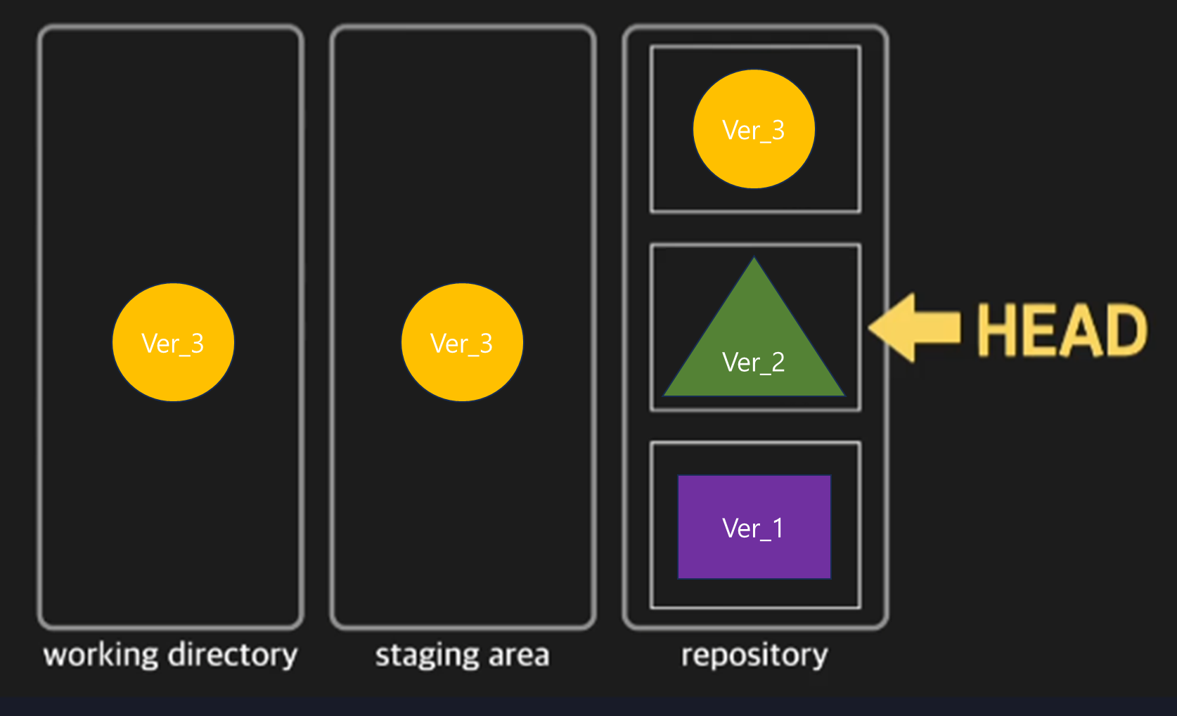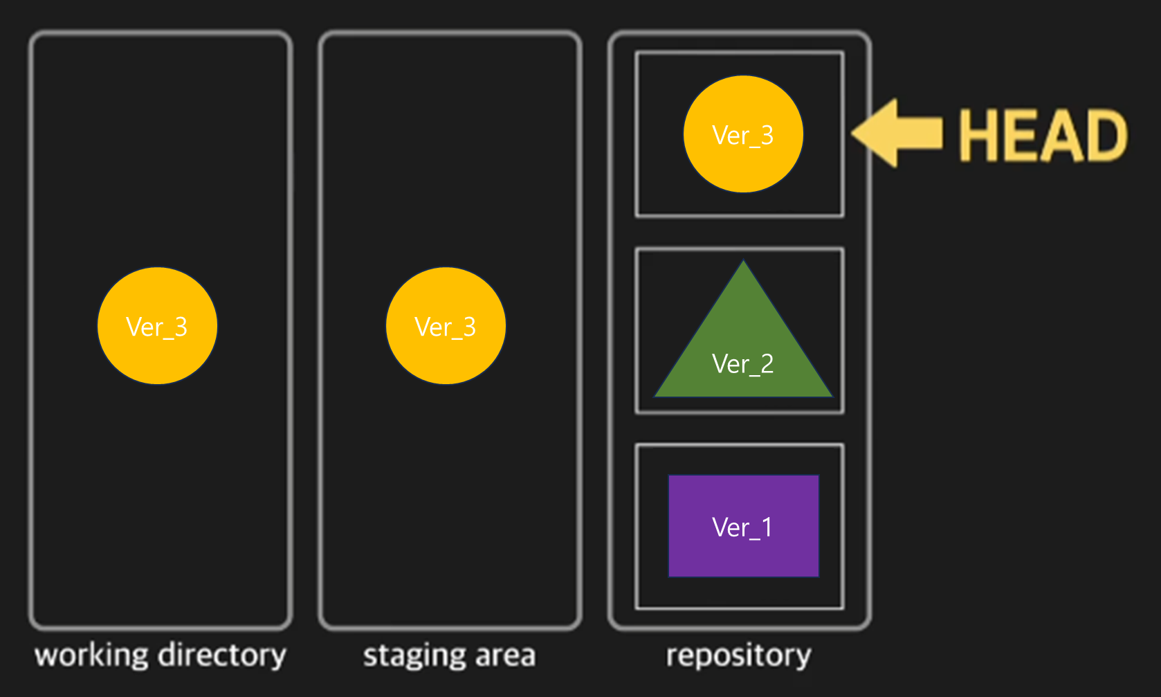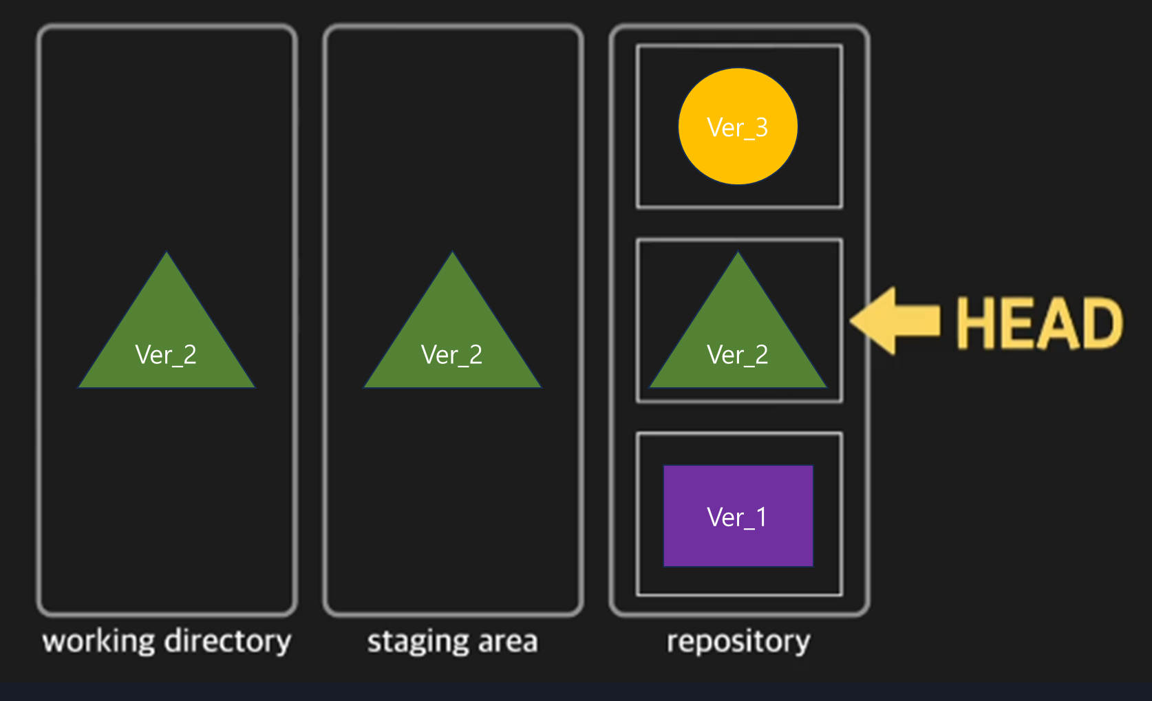 스테이징 에어리어와 워킹 디렉토리도 ver_2의 커밋에 있는 모습으로 바뀐다.