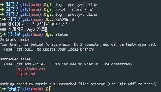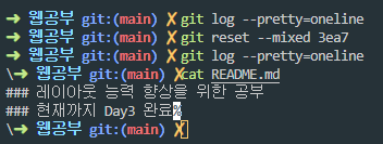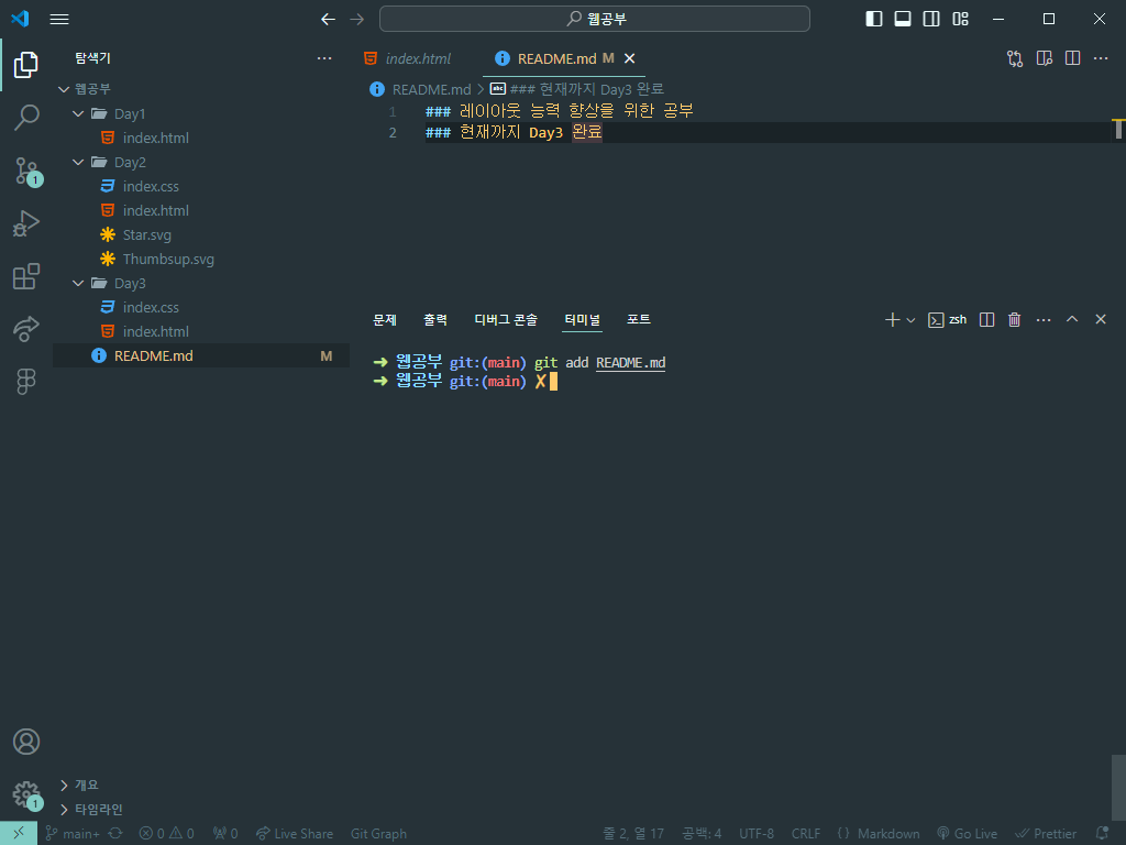 ▼ README.md 파일에 내용 추가 - ###현재까지 Day3완료